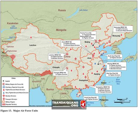 Xét sự phân bổ của lực lượng không quân Trung Quốc, có thể thấy mũi nhọn tập kích đường không nếu xảy ra, sẽ nằm chủ yếu ở hướng Vịnh Bắc Bộ, hạm đội Nam Hải có hai sư đoàn không quân, quân khu Quảng Châu có hai sư đoàn không quân nằm cận kề biên giới Việt Nam hướng Quảng Ninh và Lạng Sơn, đòn tập kích có thể theo hướng này. Quân khu Thành Đô có một sư đoàn không quân, hướng tấn công theo trục Lào Cai – Việt Trì. Đây là những lực lượng không quân tương đối mạnh, có thể uy hiếp khu vực đồng bằng Bắc Bộ bằng tên lửa hành trình phóng từ máy bay ngay cả khi chưa xâm nhập không phận Việt Nam.