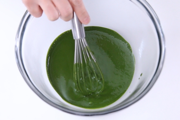 Bước 1: Cho nước nóng vào hòa với bột trà xanh trong một bát, khuấy cho đến khi bột mịn.