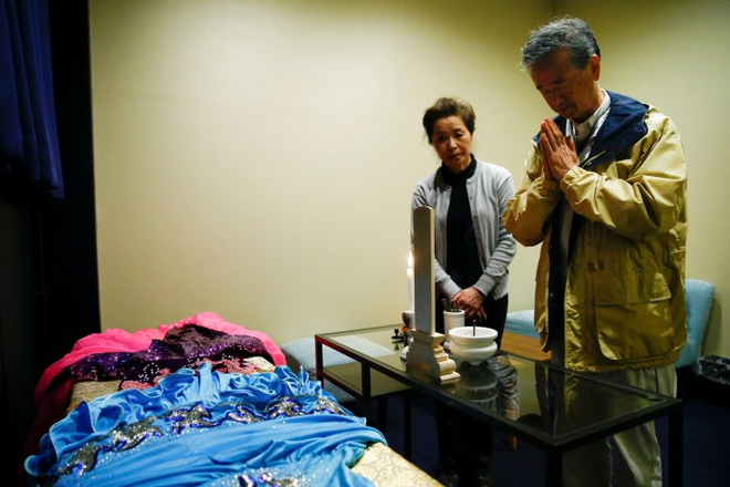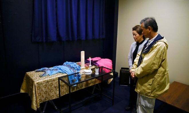 Ông Hirokazu Hosaka và vợ Minako đang tưởng niệm trước người mẹ quá cố tại khách sạn tử thi Sousou.