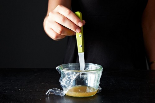 Cho giấm táo vào trong một chiếc bát nhỏ và thêm một vài giọt nước rửa chén. Bọc lại bằng màng ni-long (có thể dùng chun để giữ chặt và căng túi) rồi dùng dĩa chọc ba – bốn lỗ. Những chú ruồi giấm không chỉ bị mắc kẹt mà còn bị chết đuối. Xà phòng trong nước rửa bát sẽ làm thay đổi sức căng bề mặt của giấm khiến ruồi dính chân và rơi vào trong nước.