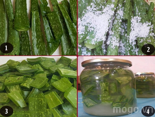 + Bỏ nha đam đã cắt khúc vào bình thủy tinh, cho thêm đường và 1 muỗng canh muối biển, lấy đũa dài trộn đều lên.