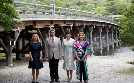 (Từ trái sang)Bà Malgorzata Tusk (L)- vợ của chủ tịch Hội đồng Liên minh châu Âu Donald Tusk, ông Joachim Sauer- phu quân Thủ tướng Đức Angela Merkel, bà Akie Abe- phu nhân Thủ tướng Nhật Shinzo Abe và Sophie Gregoire-Trudeau- phu nhân Thủ tướng Canada Justin Trudeau, cùng chụp ảnh lưu niệm bên cầu Ujibashi. Ảnh: Reuters