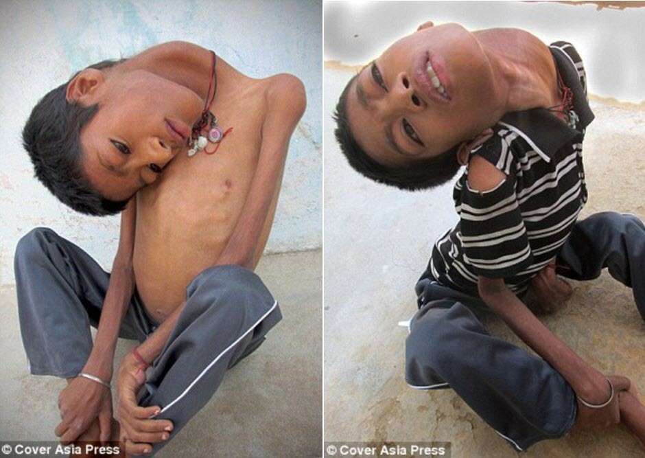 Cậu bé Mahendra Ahirwar 13 tuổi ở bang Madhya, Ấn Độ thật vô cùng đáng thương khi sinh ra đã có cái đầu gập xuống tật ngực. Còn đang thương hơn dân làng còn xa lánh cậu vì coi cậu như ma quỷ vậy. Cậu đã mắc căn bệnh gì vậy?