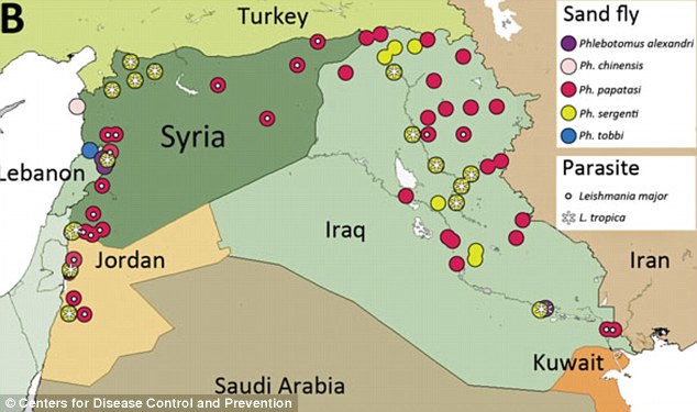 Bản đồ cho thấy mức độ lan truyền của loài ruồi cát tại các nước thuộc khu vực Trung Đông.