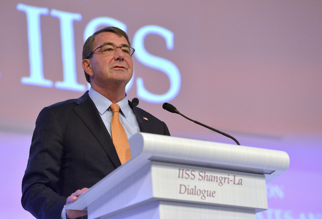 Bộ trưởng Quốc phòng Mỹ Ashton Carter phát biểu tại Shangri-La 2015. Ảnh: Bộ Quốc phòng Mỹ