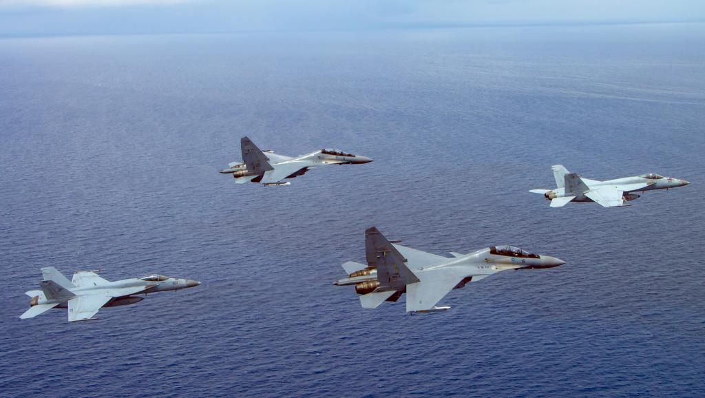 Hai chiếc F/A-18 Super Hornets và hai SU-30MKM/Flanker H của Malaysia,bay phía trên chiến hạm USS Carl Vinson của Mỹ trong cuộc tập trận tại Biển Đông ngày 10/05/2015.