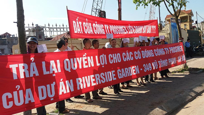 Liên tiếp các ngày 31/5 và 1/6, nhóm cổ đông nắm giữ gần 10% vốn của CTCP Sản xuất kinh doanh xuất nhập khẩu Prosimex giăng biểu ngữ trước trụ sở công ty (nay là Dự án Riverside, địa chỉ ở phường Khương Đình, quận Thanh Xuân, Hà Nội) yêu cầu đòi quyền lợi.