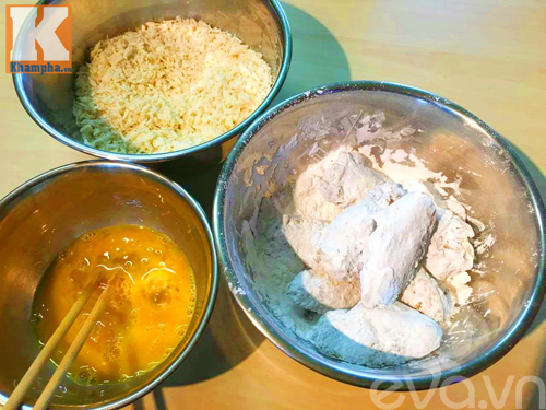 Bước 6: Cho cánh gà vào tô bột chiên giòn của Nhật, lăn cho bột chiên giòn dính chặt vào cánh gà cánh gà.