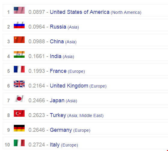 Các quốc gia Mỹ, Nga và Trung Quốc lần lượt tiếp tục giữ vững ba vị trí dẫn đầu. Xếp ở vị trí thứ tư là Ấn Độ. Kế đến lần lượt là Pháp, Anh, Nhật Bản, Thổ Nhĩ Kỳ, Đức và Italy. Hàn Quốc đã ra khỏi top 10, đứng thứ 11. Năm ngoái, sức mạnh Quân sự Hàn Quốc xếp thứ 7.