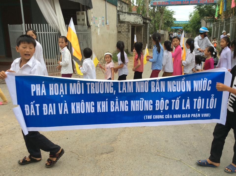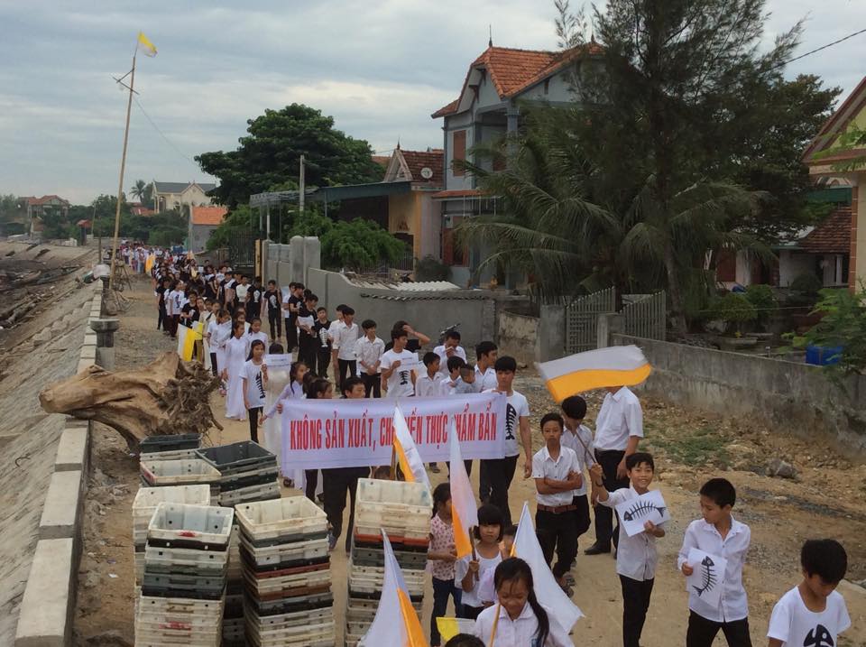 Sau thánh lễ sáng Chúa Nhật, từ người già cho đến trẻ nhỏ đều ăn mặc chỉnh tề với nhiều băng rôn và khẩu hiệu xuống đường biểu tình phản đối Formosa, đòi công lý cho các nạn nhân thảm họa môi trường và bày tỏ tình hiệp thông với Đức Cha Phaolô Nguyễn Thái Hợp, giám mục giáo phận Vinh.