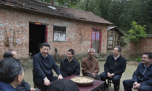 Chủ tịch Trung Quốc Tập Cận Bình mặc chiếc áo gió quen thuộc khi đến thăm một vùng nông thôn. Người nông dân ngồi bên cạnh ông cũng mặc chiếc áo tương tự. Ảnh: Xinhua