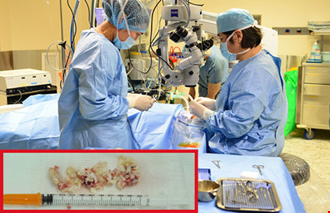 Các bác sĩ đang tiến hành một ca phẫu thuật tạo hình lại mũi cho bệnh nhân. Ảnh: H.PHƯỢNG. Ảnh nhỏ: Silicon được lấy ra từ mũi của bệnh nhân.