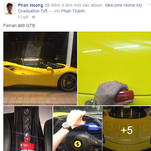Vậy mà mới đây, chiếc siêu xe Ferrari 488 GTB màu vàng được Phan Thành tặng cho em trai của mình, Phan Hoàng sau khi cậu ấm này tốt nghiệp, dân cư mạng xã hội không khỏi choáng váng vì đô chịu chơi của vị đại gia trẻ này