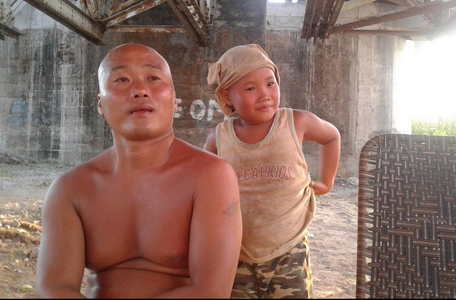 Sinh năm 1974, người đàn ông 42 tuổi hiện đang sống cùng vợ và con gái trong mái nhà tre ở bãi giữa sông Hồng. Họ chuyển về đây gần 1 năm nay. Được biết, đây là một người đàn ông có nhiều điều “quái dị”. Con gái anh, bé Đức Hạnh mới 7 tuổi, làn da rám nắng vì cũng cởi trần suốt ngày.