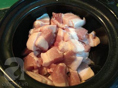 Sau đó đổ nước xăm xắp mặt thịt. Cho sấu vào. Đậy vung nồi om cho tới khi thịt mềm.