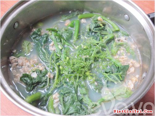 Đun sôi canh rồi thả thì là vào, nêm nếm thêm chút hạt nêm cho vừa miệng là được.