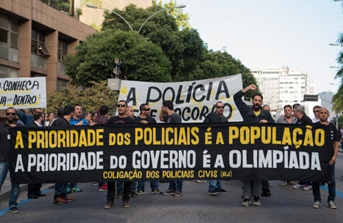 Khoảng 300 cảnh sát mặc áo đen đứng phía ngoài ṭa nhà lập pháp bang Rio de Janeiro để phản đối cái họ gọi là sự bỏ rơi trước thềm Olympic, bắt đầu từ ngày 5/8. "Ưu tiên của cảnh sát là người dân, ưu tiên của chính phủ là Olympic", một biểu ngữ viết.