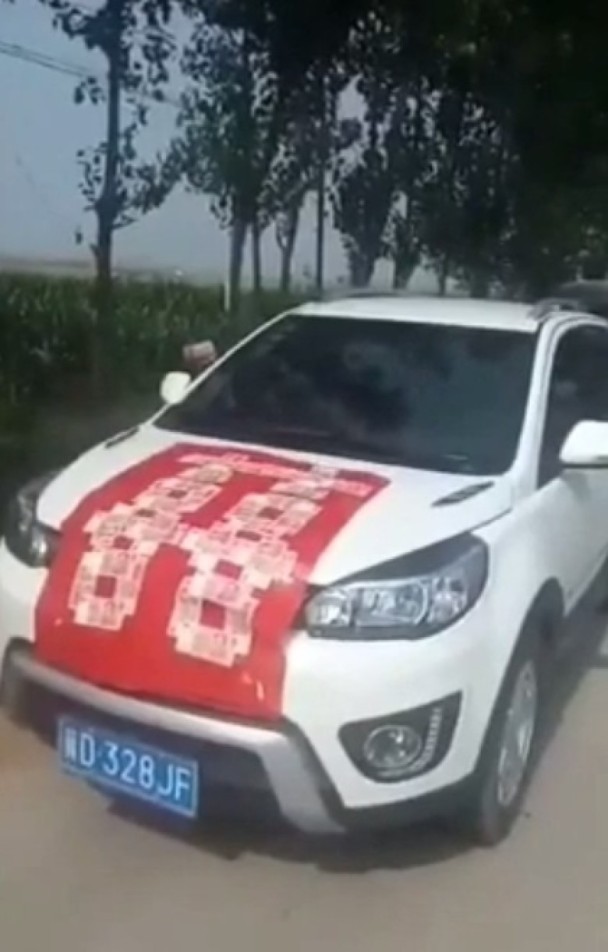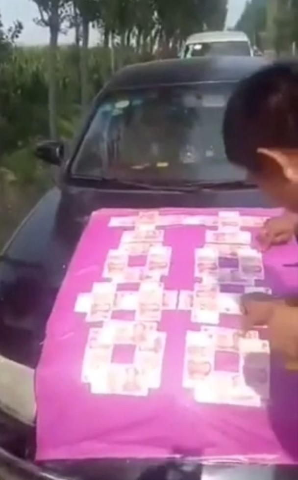 Theo mạng tin Đông Phương, mới đây tại thành phố Hàm Đan, tỉnh Hà Bắc, tại một đám cưới, nhà trai để thể hiện sự giàu có của gia đình, đã sử dụng tiền thật là giấy bạc mệnh giá 100 NDT mới cứng để làm thành hình chữ “Song Hỉ” dán ở đầu các xe trong đoàn xe đi rước dâu.