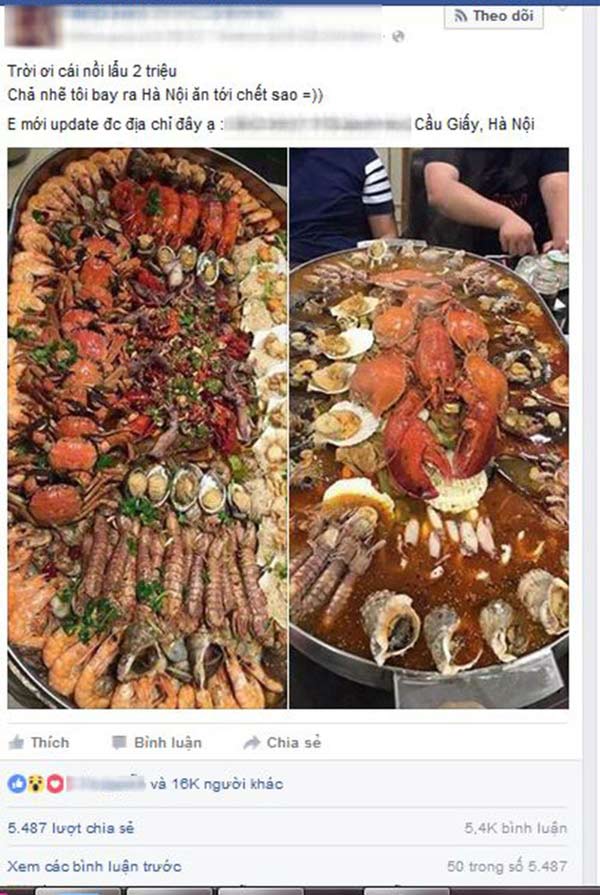 Những hình ảnh bắt mắt này được đăng tải bởi một Facebooker không mấy nổi danh, có lẽ đang sống ở một thành phố khác ngoài Hà Nội, và đã hút về hơn 5.000 lượt chia sẻ và bình luận, 16.000 lượt like chỉ trong vòng 1 ngày. Với dòng cảm thán rất đỗi đáng yêu: "Trời ơi cái nồi lẩu 2 triệu, chả nhẽ tôi bay ra Hà Nội ăn tới chết sao?" và hai bức ảnh, Facebooker này đã khiến hàng nghìn người nhao nhao rủ nhau đi chiêm ngưỡng tận mắt, ăn tận miệng nồi lẩu này, nhất là sau khi địa chỉ của quán bán nồi lẩu độc nhất vô nhị này ở ngay Cầu Giấy, Hà Nội.