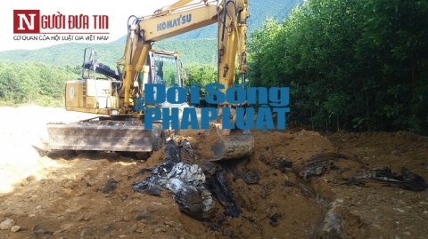Phóng viên xuyên vào rừng tràm, mật phục ghi lại những hình ảnh khó tin: Khu đất hàng ngàn m2 tạo thành vùng lõm giữa những thân tràm bao bọc. Và những chiếc xe tải phủ kín bạt, oằn mình từ nhà máy Formosa Hà Tĩnh chở theo những bao tải chất thải mang đổ xuống bãi này. Xe đổ đến đâu, hệ thống máy múc tiến hành san lấp đến đó.