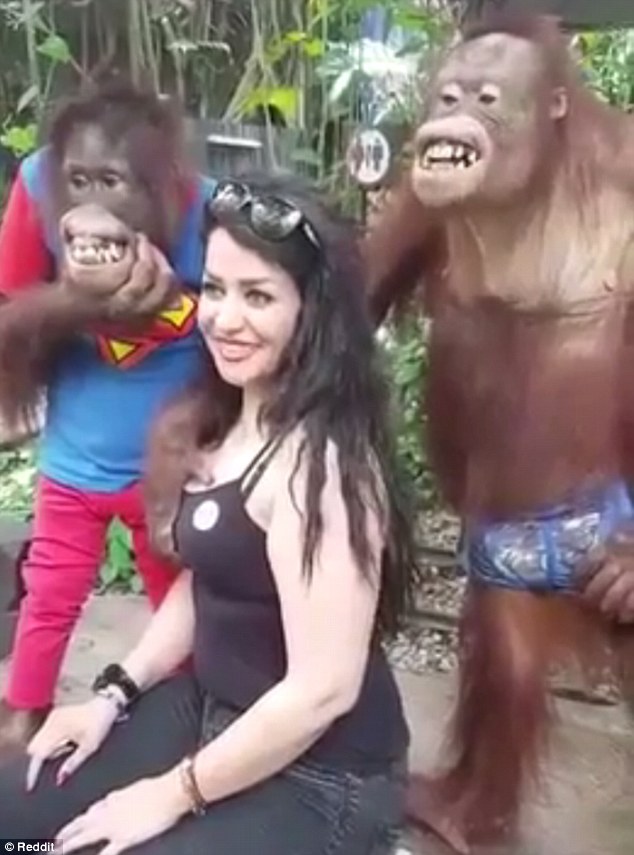 Đang vui vẻ tạo dáng bên 2 chú đười ươi...