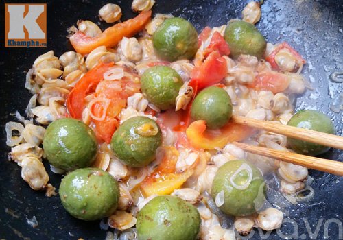 Bước 5: Đun nóng dầu ăn trong nồi, cho hành khô vào phi thơm rồi cho cà chua vào xào mềm, nêm gia vị. Tiếp đó cho tiếp ngao và một chút nước mắm vào đảo qua rồi cho sấu vào.