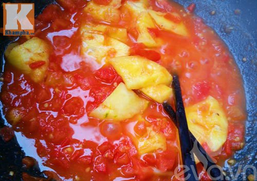 Bước 5: Phi thơm hành cùng một chút dầu ăn, cho cà chua vào đảo nhừ. Khi cà chua nhừ thì cho tiếp dứa vào đảo cùng với gia vị cho vừa nước sốt. Thêm chút nước lọc và đun sôi trên bếp khoảng 5 phút. Khi thấy nước sốt sánh lại thì đổ ra bát.