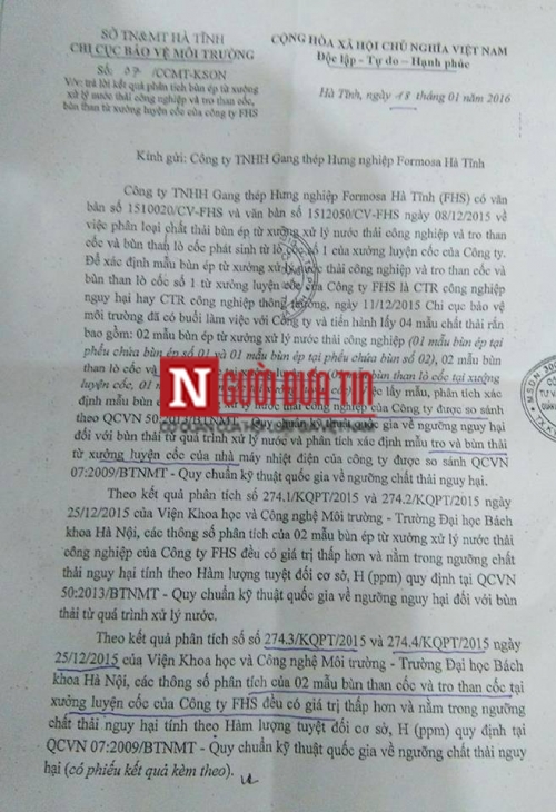 Theo đó, lý do mà Formosa có thể dễ dàng ký hợp đồng với công ty xử lý rác thải là do ngày 18/1/2016, Chi cục bảo vệ môi trường – Sở TN&MT Hà Tĩnh có một công văn gửi tới Formosa. Công văn này khẳng định rằng bùn ép từ xưởng xử lý và bùn than từ lò của Formosa là chất thải rắn công nghiệp thông thường.
