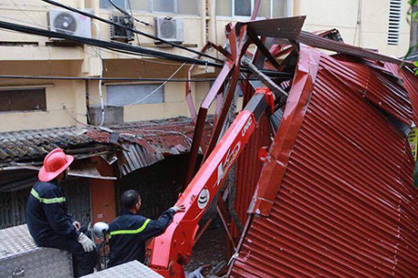 Mái tôn của các nhà dân trên đường Hoàng Quốc Việt (Cầu Giấy) bị gió “thổi” bay, nằm la liệt trên đường.