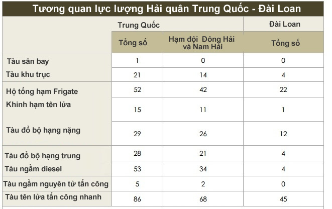 Bảng so sánh tương quan lực lượng chiến hạm nổi và tàu ngầm của hai bên cho thấy ưu thế tuyệt đối về binh lực của lực lượng hải quân Trung Quốc. Về nguyên tắc không thể so sánh lực lượng không quân hải quân Trung Quốc (KQHQ) và lực lượng không quân biển Đài Loan do lực lượng KQHQ Trung Quốc là lực lượng tấn công chủ lực trên không gian biển quy mô chiến lược chiến dịch, KQHQ Đài Loan chỉ giới hạn trong nhiệm vụ tuần biển, chống ngầm trên các vùng nước ven bờ đảo Đài Loan, tổng số có khoảng 28 chiếc máy bay trinh sát, tác chiến điện tử, cảnh báo sớm, tuần biển chống ngầm và một số máy bay trực thăng chống ngầm.