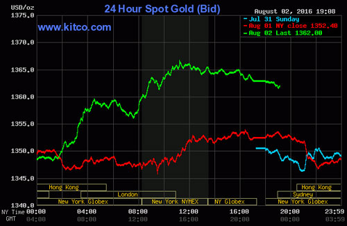 Tính tới 5h25 sáng 3/8 (giờ Việt Nam), giá vàng giao ngay trên thị trường châu Á giảm 0,3 USD xuống 1.362,5 USD/ounce sau khi tăng khoảng 10 USD trên sàn NY. Như vậy, giá vàng giao ngay không c̣n xa so với mức đỉnh cao 1.376 USD/ounce hơn 2 năm ghi nhận trong tuần đầu tháng 7.