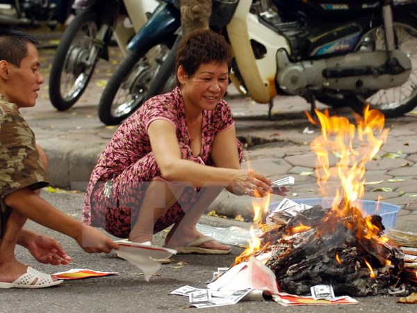Người dân vẫn "hồn nhiên" đốt vàng mã trên đường phố Hà Nội. (Ảnh: Nhật Anh/TTXVN)