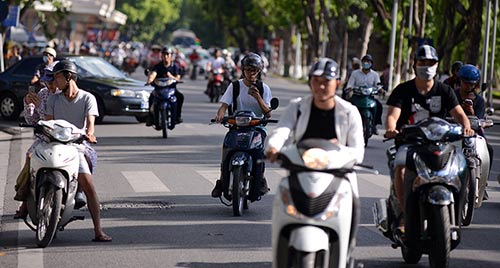 Một tay lái xe máy, một tay cầm điện thoai và mắt dán vào màn hình smartphone.