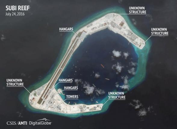 Ảnh vệ tinh mới nhất cho thấy những kho chứa máy bay quân sự của Trung Quốc ở đá Xu Bi, quần đảo Trường Sa, Việt Nam.