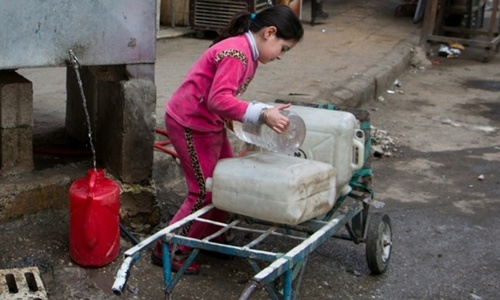 Một bé gái đi lấy nước sinh hoạt tại một bể công cộng ở Aleppo. Ảnh: AFP