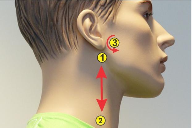 Điểm 1 và 2: Điểm 1 bắt đầu từ phía sau sụn tai đi xuống điểm 2 ở giữa xương cổ. Dùng ngón tay nhẹ nhàng di chuyển từ điểm 1 đến điểm 2, thực hiện mỗi bên tai 10 lần. Lưu ý không ấn mạnh hay xoa bóp mạnh.