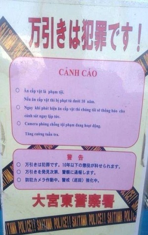 Một biển cảnh báo ăn trộm tại siêu thị Nhật có ghi tiếng Việt