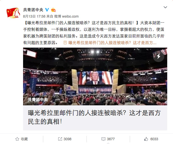 Trang của Hội Liên hiệp Thanh niên Trung Quốc đăng một tin, nói rằng: “Các nguồn tin trong vụ rò rỉ thư điện tử (email) của bà Hillary đều bị ám sát, từng người một? Đây chính là sự thật về nền dân chủ phương Tây”.