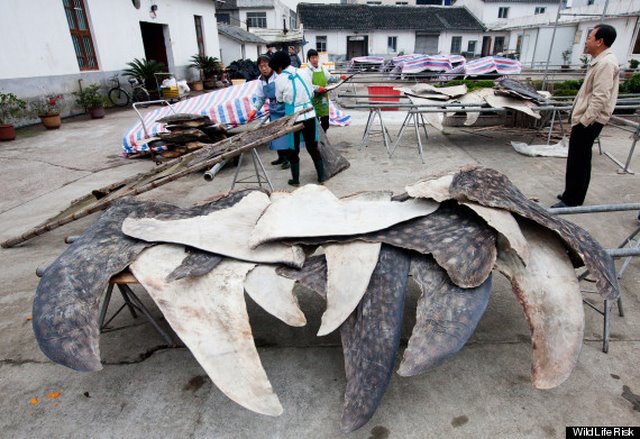 Vây cá mập đang được ngư dân Trung Quốc phơi khô sau khi khai thác ở Biển Đông.