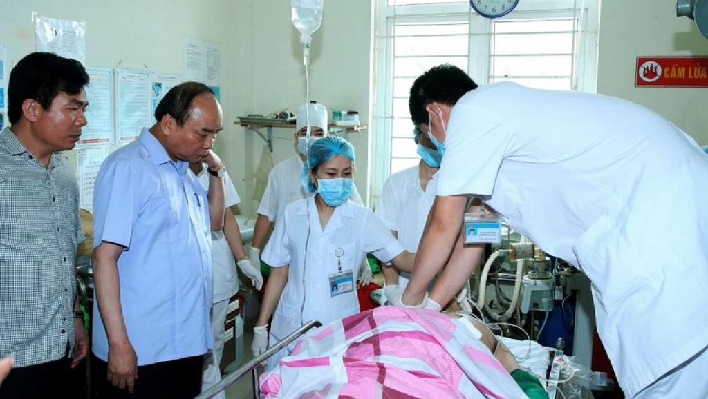 Thủ tướng Việt Nam Nguyễn Xuân Phúc đến thăm một trong hai nạn nhân sau vụ bắn hai lãnh đạo cao cấp tỉnh Yên Bái ngày 18/08/2016.