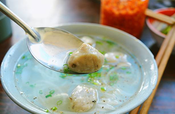Tô bánh căn bưng ra có sợi nhỏ xíu cùng với vị thanh ngọt của nước dùng ăn cùng miếng chả đậm đà hương vị miền biển.