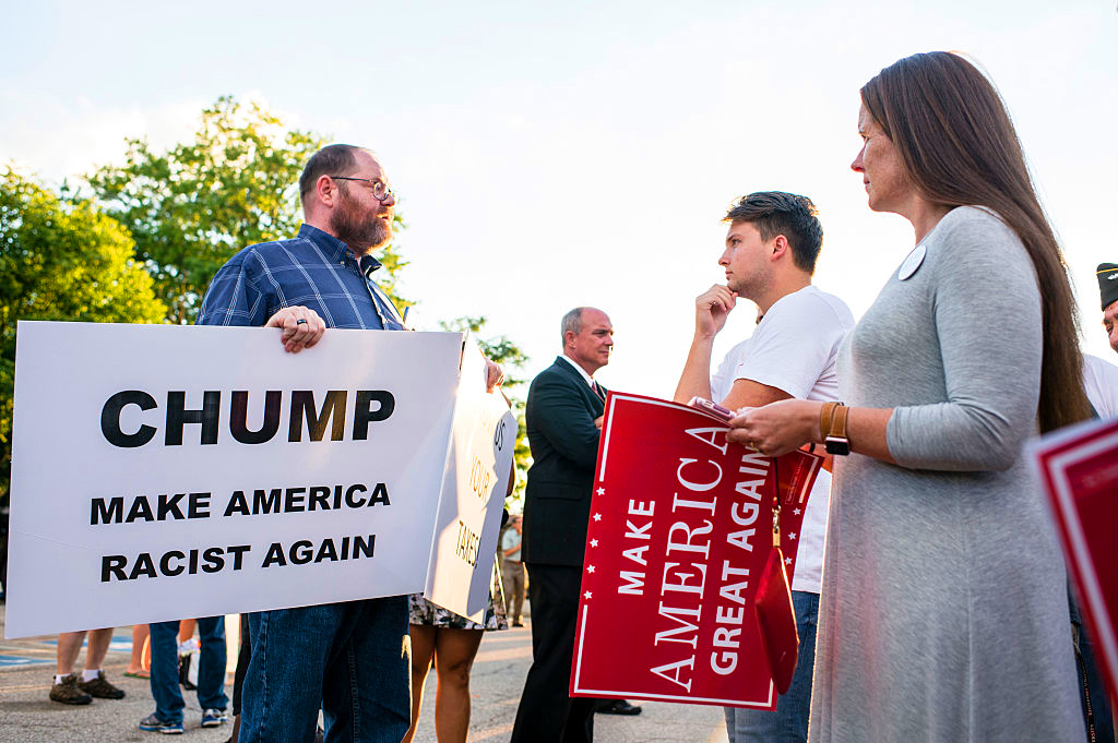 Đụng độ. Một người chống ông Donald Trump (bên trái) đang bị những người ủng hộ ông Trump chất vấn bên ngoài một sân vận động ở Akron, Ohio, nơi mà ông Trump đă đến vận động cử tri ngày thứ Hai. (Angelo Merendino/ Getty Images)