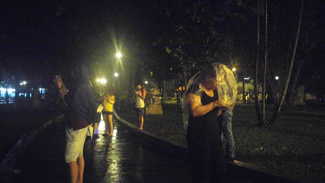 Đến 23h, cơn mưa vẫn chưa ngớt, nhiều người vẫn nán lại công viên Tao Đàn. Họ rảo quanh công viện trong những chiếc ô, áo mưa và thậm chí có nhiều người chỉ đội lên đầu một bao nilon, chiếc áo khoác có mũ sũng nước, lượn lờ trong công viên tối om để săn thú ảo.
