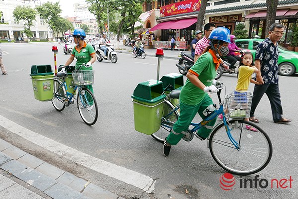 Thời gian gần đây, trên đường phố Hà Nội xuất hiện nhiều nhân viên vệ sinh môi trường đi thu gom rác bằng xe đạp.