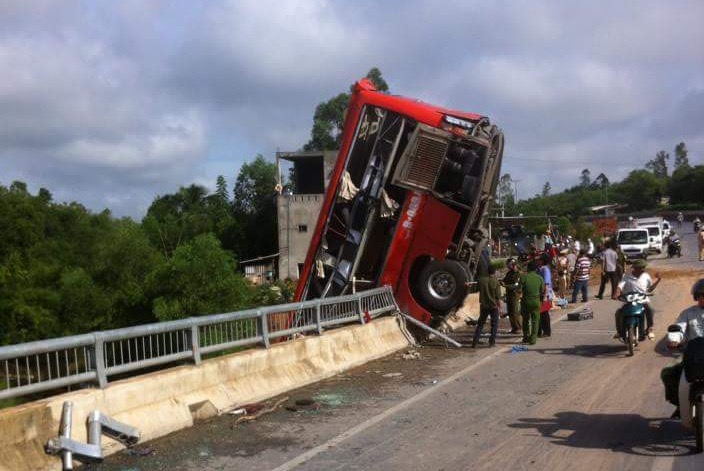 Tại hiện trường, chiếc xe khách treo lơ lửng trên thành cầu, đầu xe cắm thẳng xuống đất.