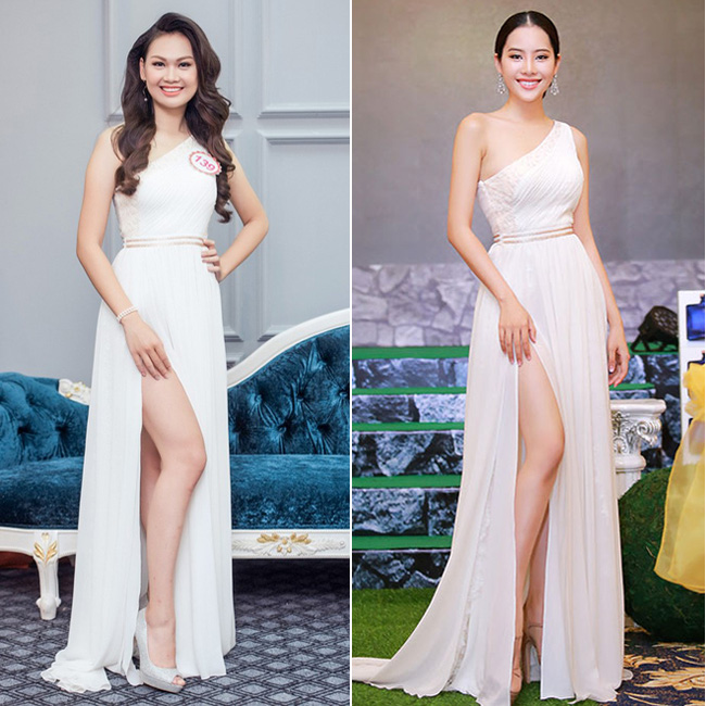 Sinh viên Học viện Báo chí Tuyên truyền - Nguyễn Hương Mỹ Linh - được đánh giá cao ở gương mặt tươi sáng và chiều cao 1,75 m. Cô nàng này lại "đụng hàng" với người đẹp Nam Em - Hoa khôi Đồng bằng Sông Cửu Long trong chiếc đầm trắng xẻ tà gợi cảm.