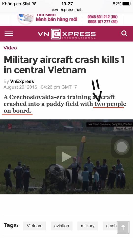 Vừa qua xảy ra sự cố máy bay quân sự L-39 gặp sự cố tai nạn trên cánh đồng gây chấn động.Ngay sau đó,nhiều người khá bất ngờ trước thông tin có những 2 phi công trên một chiếc máy bay chứ không phải một.Nguồn tin tiết lộ ngay sau đó đã được gỡ bỏ.