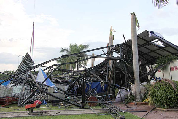Toàn bộ các khung sắt lắp ráp, thanh và miếng sắt cong vẹo, đổ ngã