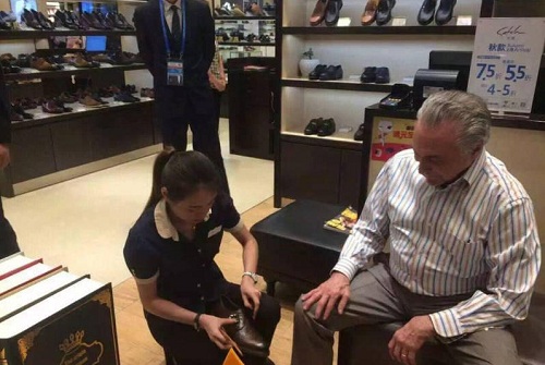 "Cho tôi thử đôi này số 39 được không?" phiên dịch viên đi theo ông hỏi nhân viên bán hàng.