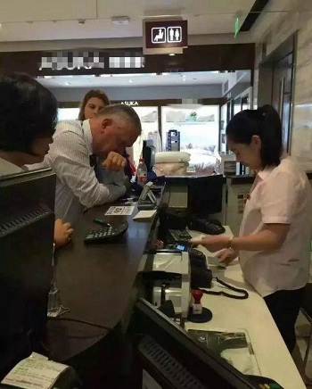 Ông Temer quẹt thẻ visa tại quầy thanh toán. Ảnh: QQ